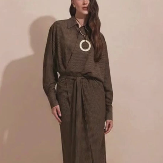 The 100% silk Striped Maxi Shirt Dress by Petar Petrov reimagines the classic shirt dress through a lens of fluidity and movement. Crafted from printed silk, it drapes effortlessly around the body with an oversized wrap design and panelled wrap skirt. The adjustable waist tie shapes a generous, shifting silhouette, while wide-cuffed sleeves and a classic shirt collar add structure to its airy, full-length form.